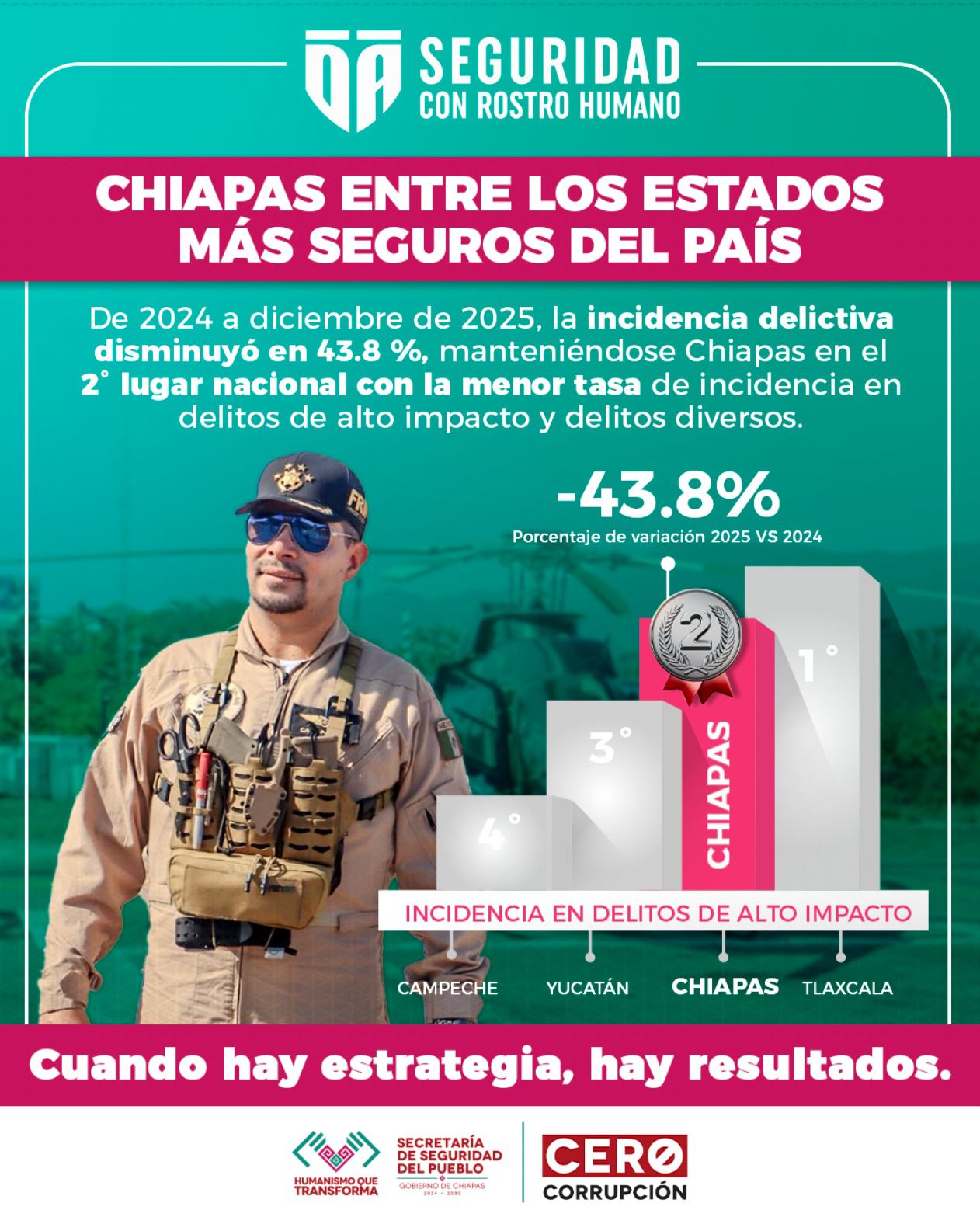 Tuxtla Gutiérrez, Chiapas; 17 de enero de 2026.- La Secretaría de Seguridad del Pueblo (SSP), que encabeza Óscar Alberto Aparicio Avendaño, informó que, de acuerdo con el Reporte de Incidencia Delictiva Nacional, con corte a diciembre de 2025 y presentado en enero de 2026, Chiapas se mantiene entre las entidades con los niveles más bajos de incidencia delictiva a nivel nacional, reflejo del fortalecimiento de la estrategia integral de seguridad, de la visión del gobernador del estado, Eduardo Ramírez Aguilar, y de la coordinación interinstitucional.