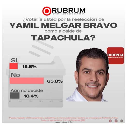 Tapachula, Chiapas., a 17 de febrero del 2026 (DSN). – Una encuesta difundida por la casa consultora Rubrum coloca en una posición desfavorable al alcalde de Tapachula, Yamil Melgar Bravo, en un eventual escenario de reelección. El ejercicio demoscópico revela que 65.8% de los encuestados respondió que no votaría por su continuidad, frente a apenas 15.8% que dijo que sí, mientras que 18.4% aún no decide.