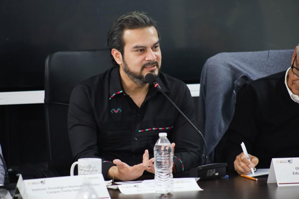 Desde la sala “Jacinto Arias”, el titular de la política educativa expuso ante representantes del Tecnológico Nacional de México (TecNM), campus Tuxtla Gutiérrez, Comitán, Tapachula y Frontera Comalapa; del Instituto Tecnológico Superior de Cintalapa, así como de instituciones educativas y programas de apoyo educativo federal, la necesidad de continuar por la senda de la tecnología.